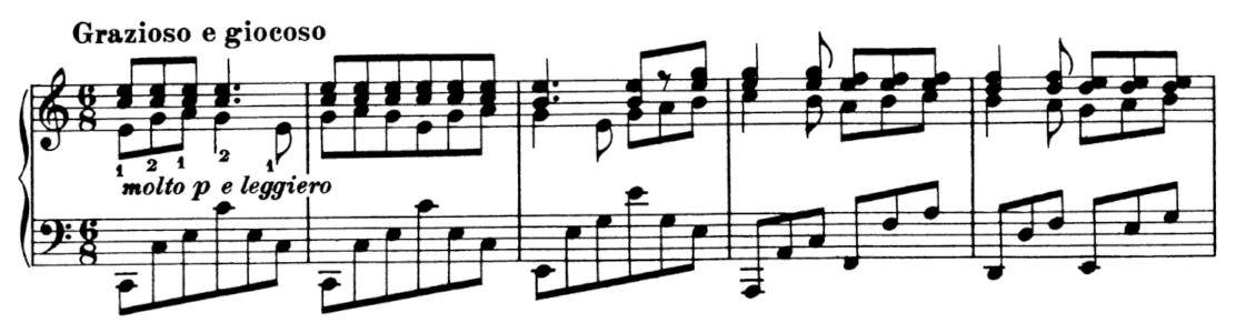 樂譜開頭寫了 Grazioso(優雅)、Giocoso(可翻成愉快、活潑或戲謔的意思)。所以不能活潑到失了優雅,這中間的拿捏,也留給彈奏者很大的詮釋空間。